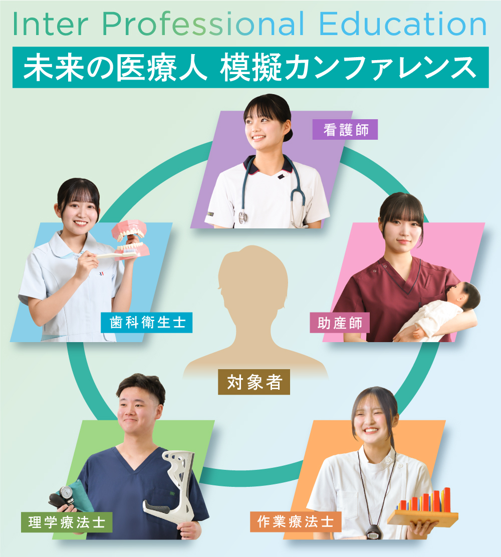 専門的な職種を目指して学ぶ学生が、時間と場所を共有し、職種同士のコミュニケーションの取り方や、職種の守備範囲や視点について学習するプログラムです。本校では専門職としての成長段階に応じて学生同士が共に学び合う授業を行っています。