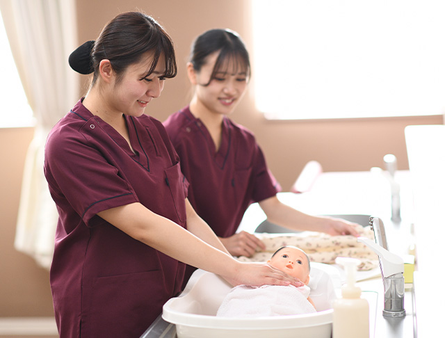 臨地実習では多くの妊産婦さんのご協力のもと、分娩介助や妊婦健診などを行い、丁寧なリフレクションを行いながら、助産師として羽ばたくための判断力や基礎的な技術を身につけていきます。